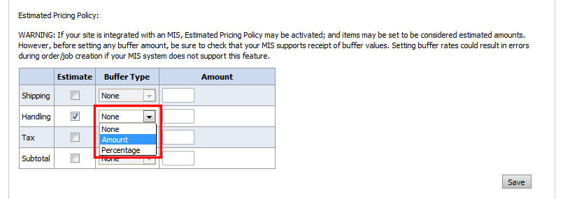 Note: For sites integrated with an MIS: If you want to use the estimated pricing feature, make sure that your MIS supports receiving buffer values. If it does not, you can use estimated pricing (e.g., to designate a bucket such as shipping, handling, etc.) as estimated, not actual, but leave the Buffer Type option set to None so you cannot enter an amount. The message will still be displayed in checkout in this case, but no additional buffer amounts will be added to the order.